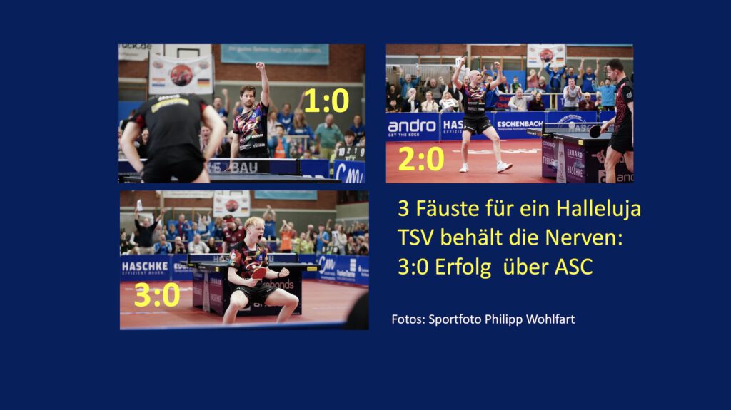 Beitragsfotos: Sportfoto Philipp Wohlfart Tür zur Rettung steht sperrangelweit offenWas für ein Nachmittag in unserer Shakehands-Arena: 3:0-Sieg über Grünwettersbach Schon vor dem ersten Ballwechsel war klar, welche enorme Bedeutung dieses…
