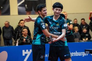 Kommen wir zu den Pflichtaufgaben: Basti Steger hatte in seinem ersten Einzel nur im ersten Satz Probleme mit Sam Walker, gewann jedoch mit zunehmender Spielzeit die Dominanz in den Ballwechseln und siegte mit 3:1, was den zwischenzeitlichen 1:1 Ausgleich zur Pause bedeutete. Nach der Pause nahm das Spiel zwischen Jin Ueda und Luka Mladenovic einen ähnlichen Verlauf. Auch hier ging der erste Satz an die Gastgeber. Jin stellte sein Spiel um, spielte nicht mehr so druckvoll auf den Anti von Mladenovic und hatte damit Erfolg. Das Resultat 3:1 Sieg für Jin Ueda und zwischenzeitliche 2:1 Führung für uns.