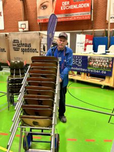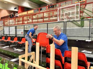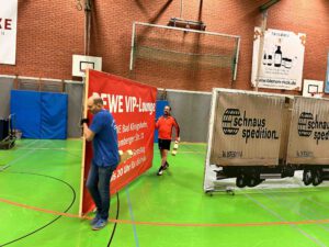 - Vor jedem Spiel wird der rote TTBL-Boden verlegt, zusätzliche Tribünen im Innenraum aufgebaut, Werbebanner angebracht.