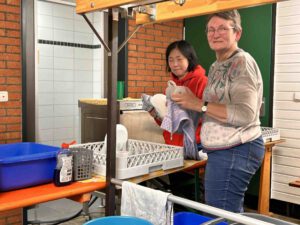 - Eine Küche? Fehlanzeige. In einer Umkleidekabine wird während des Spiels gespült – teils sogar von Hand. Zwei Helferinnen oder Helfer, die vom Match kaum etwas sehen, sorgen dafür, dass alles reibungslos läuft.