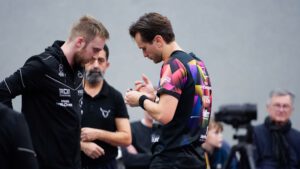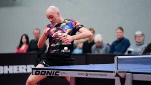 In der zweiten Partie kam es zum Duell der langjährigen Trainingspartner und Nationalmannschaftskollegen: Andreas Levenko gegen unseren Routinier Daniel Habesohn. Der erste Satz lief komplett gegen uns – Danny fand keinen Zugriff und verlor klar 2:11. Anschließend stabilisierte er sich, gewann Satz zwei und schien im Match angekommen.