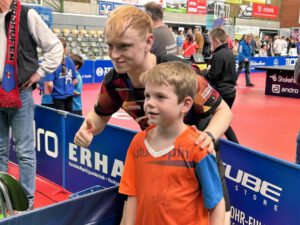 Den Auftakt machte unser Routinier Bastian Steger, der gegen den Briten Tom Jarvis zunächst kalt erwischt wurde (2:11). Doch davon ließ er sich nicht beeindrucken. Mit großer Ruhe und Erfahrung kämpfte er sich zurück, drehte das Spiel und sicherte uns mit einem 3:1 die wichtige Führung. Gerade in den engen Phasen zeigte sich einmal mehr seine Klasse, seine Variabilität und Nervenstärke.