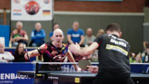 Im zweiten Einzel entwickelte sich ein echter Krimi. Daniel Habesohn traf auf seinen langjährigen internationalen Weggefährten Tiago Apolonia (Gerade 6 Tage jünger als Daniel) – und die beiden lieferten sich ein atemberaubendes und hochklassiges Duell über fünf Sätze. Nach wechselhaftem Spielverlauf bewies Dany im entscheidenden Moment die besseren Nerven, er nahm mit seinem emotionalen Spiel immer wieder die Halle mit und setzte sich am Ende in 5 Sätzen durch. Zur Pause führte unser TSV damit 2:0, ein Ergebnis, das wir so zu diesem Zeitpunkt in eigener Halle schon lange nicht mehr hatten.